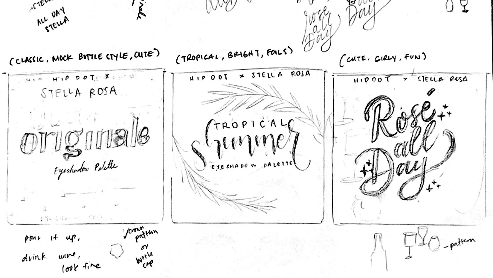 All three palettes are intended to refer back to a set of Stella Rosa flavored wines. With this in mind, I grasped a color palette for each keeping in mind the flavors we were working with. From there, it was all about incorporating the Stella Rosa language – associating the names of the shades back to the brands sassy tone and/or classic flavored wine names.